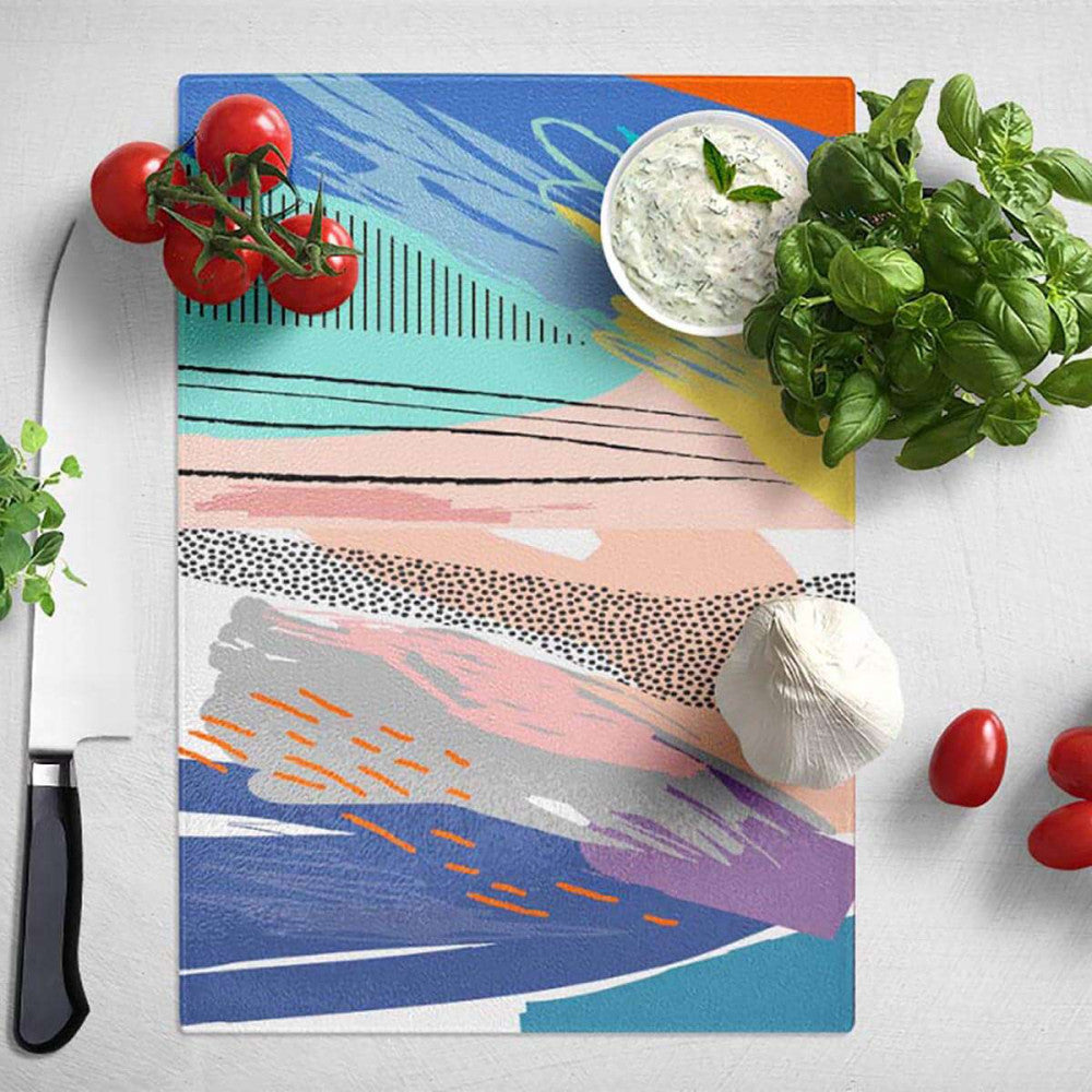 Bring the vibrant energy of summer to your kitchen with the Abstract Summer 010 Chopping Board from RockSaltPrints. This beautifully designed chopping board features striking abstract artwork, blending lively colors and dynamic shapes to create a truly unique kitchen accessory.