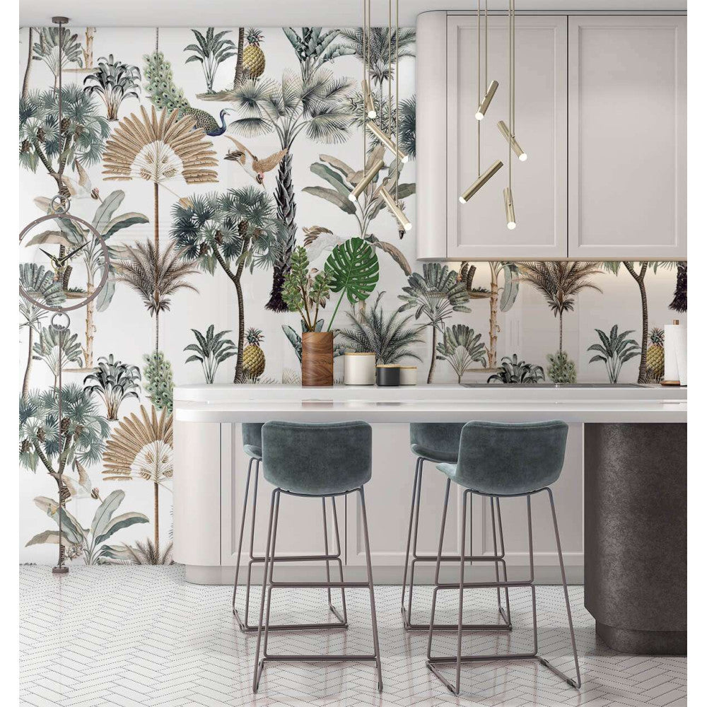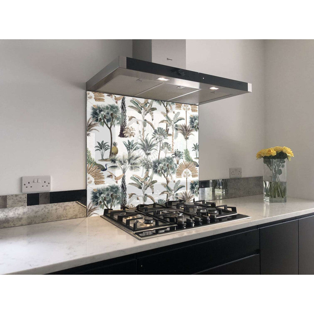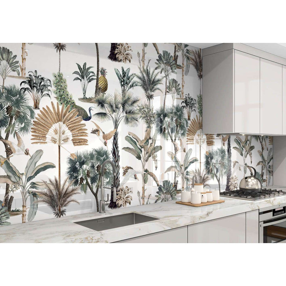 Elevate your interior design with the lush elegance of Exotic Palm Trees, available as both splashbacks and wallpaper by RockSaltPrints.