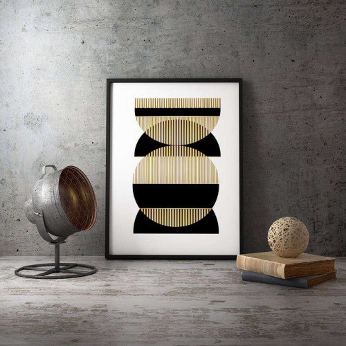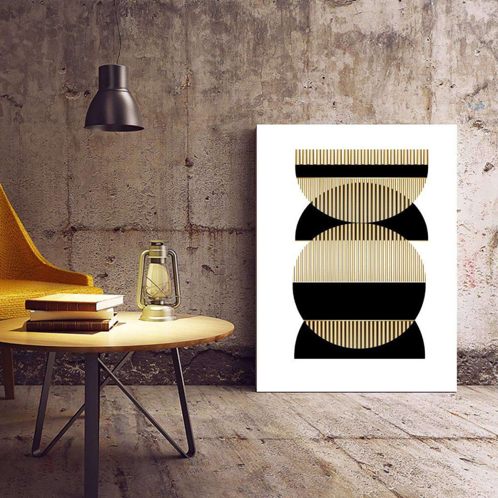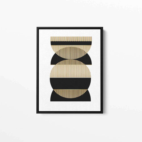 Transform your space with the striking Gold Rain with Black Circles Abstract Canvas from RockSaltPrints.