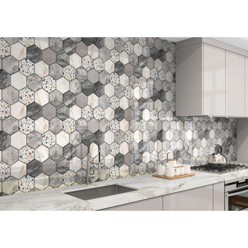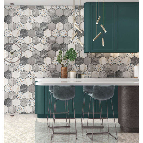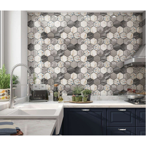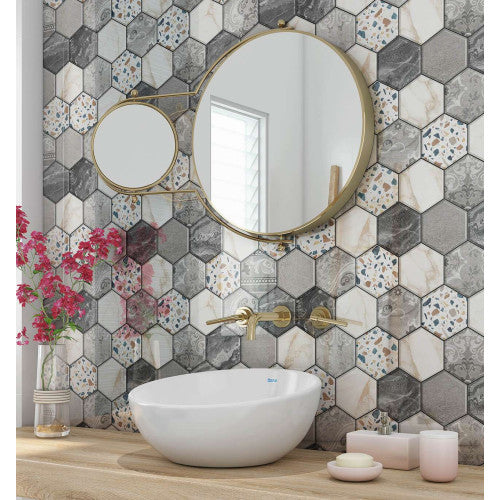 - Unique Mixed Tile Design: Features a combination of textures and colors within a geometric hexagonal layout, adding depth and personality to your walls.