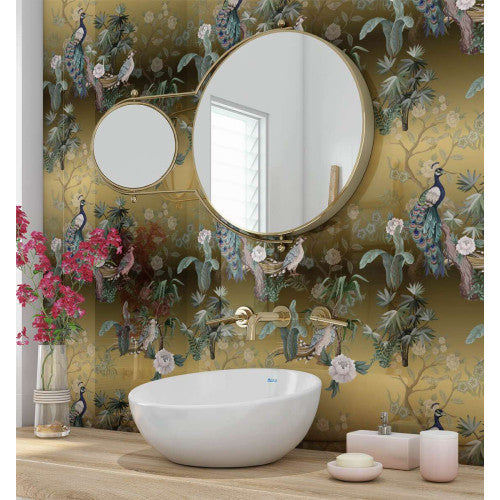 Enhance your space with the regal beauty of the Oriental Japanese Gold Peacock Birds. This luxurious design features intricate gold peacocks surrounded by delicate oriental floral and foliage patterns, inspired by traditional Japanese art. With its sophisticated gold accents and elegant detailing, this wallpaper is perfect for creating a serene, opulent atmosphere in any room.