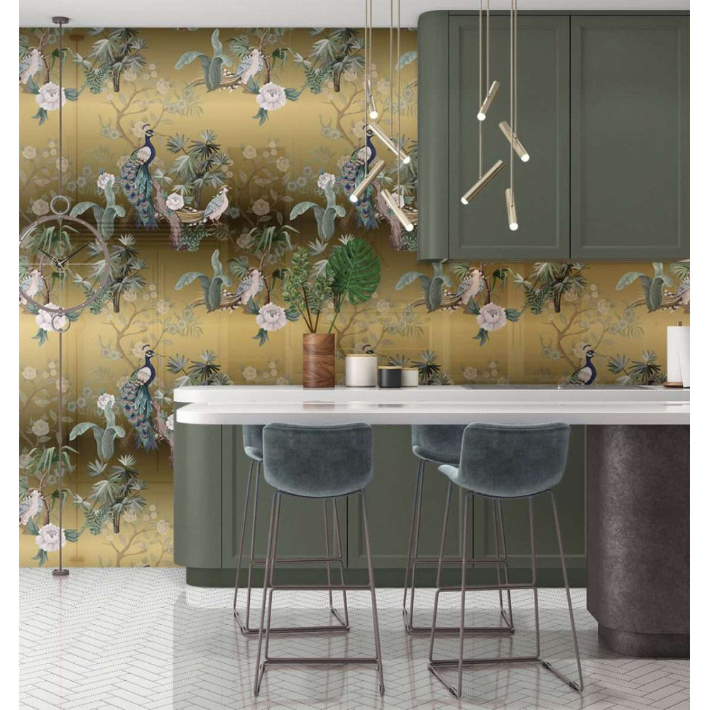 - Exquisite Gold Peacock Design: The focal point of this wallpaper is the elegant peacock, with its vibrant gold feathers and intricate detailing, symbolizing grace and luxury.
