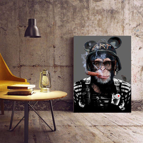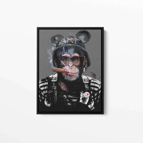 - Playful Military Chimp Portrait: The artwork features a chimp in full military gear, capturing both its mischievous charm and powerful persona.