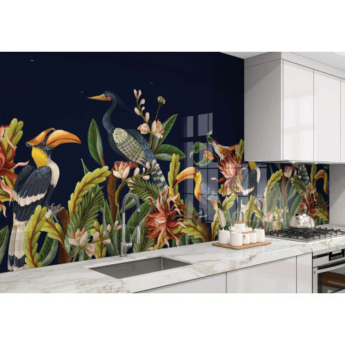 - Rich Navy Background: The deep navy blue background enhances the bold colors of the toucans and surrounding foliage, creating a striking contrast that adds depth to your walls.